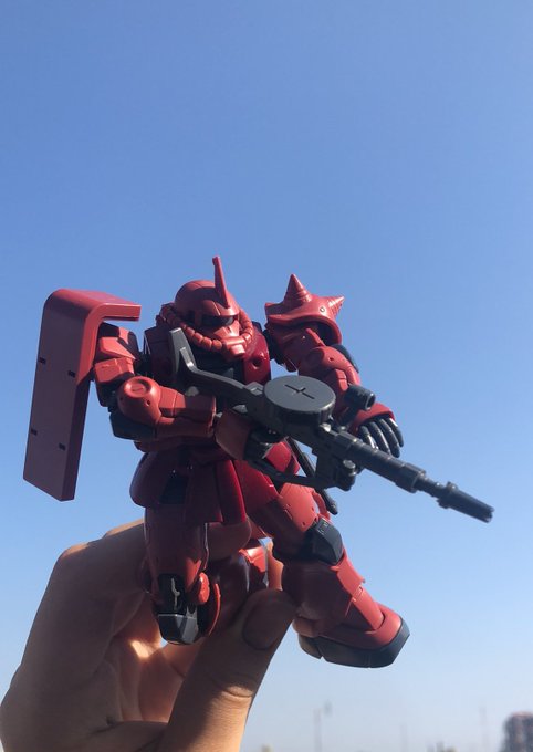 青空に映える赤いザク。 ものすごく天気が良い日はこれに限る。 #ガンプラ #ガンダム #ガンプラの画像貼るとRTされると聞いて