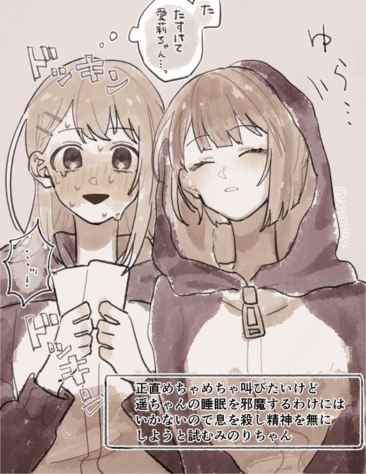 ☘️お泊まり会、気まぐれに始めたババ抜きのはずが 残ったみのりちゃんと雫ちゃんの対決が一生終わらず、一抜けした遥ちゃんがついに寝落ちてしまう回の絵