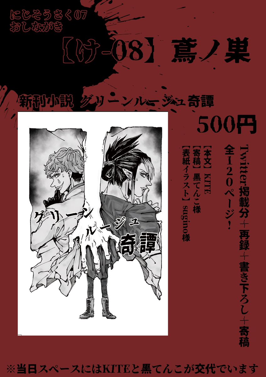 #にじそうさく07 グジュの2人が奇妙な現象に巻き込まれる微ホラー小説を販売します。 無配でイラストカードを置いているのでお気軽にお声かけください。 黒てんこ先生と交代でいます。