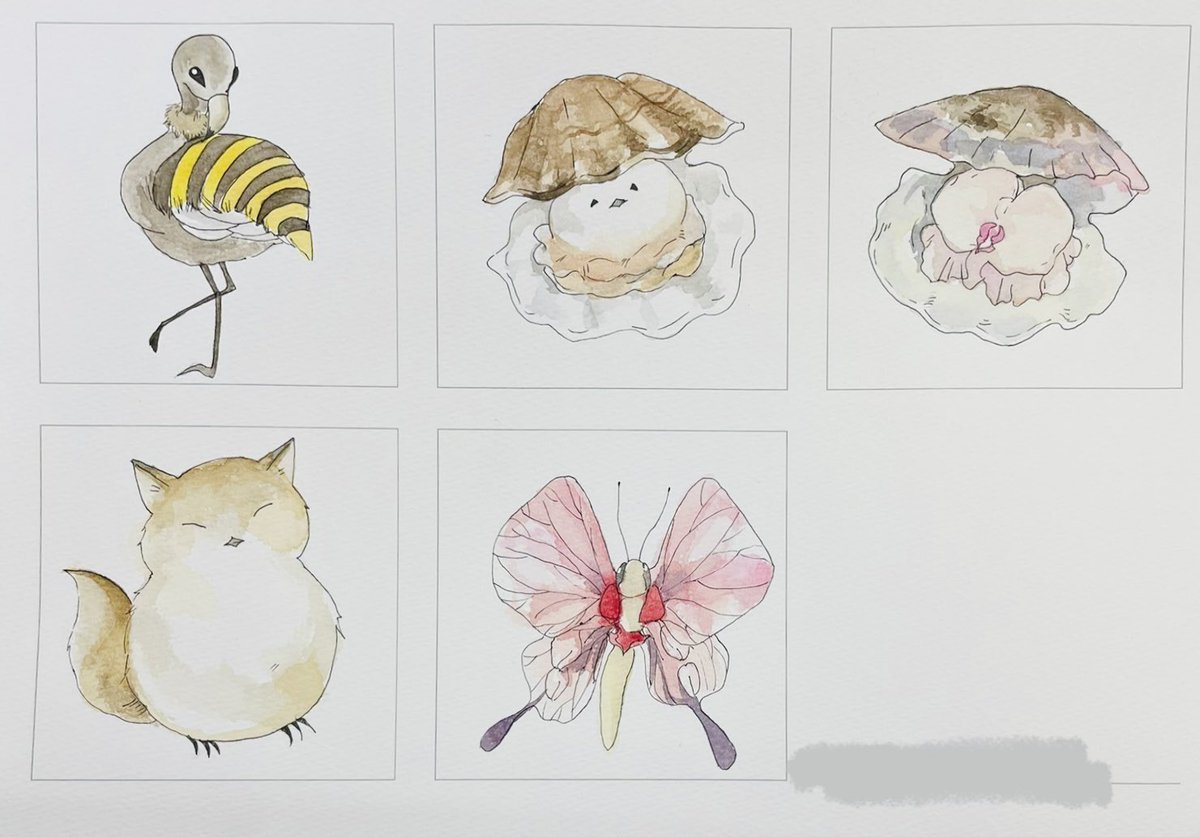 授業の課題その2 2つのものを掛け合わせてキャラクターを作る課題 上段左からフラミンゴ×ミツバチ ホタテ×シマエナガ、ホタテ×蘭 下段 キツネ×シマエナガ 蘭×アゲハ蝶 #水彩 #アナログ