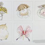 2 18 授業の課題その2 2つのものを掛け合わせてキャラクターを作る課題 上段左からフラミンゴ×ミツバチ ホタテ×シマエナガ、ホタテ×蘭 下段 キツネ×シマエナガ 蘭×アゲハ蝶 #水彩 #アナログ 22/05/10 00:02
