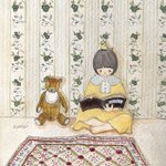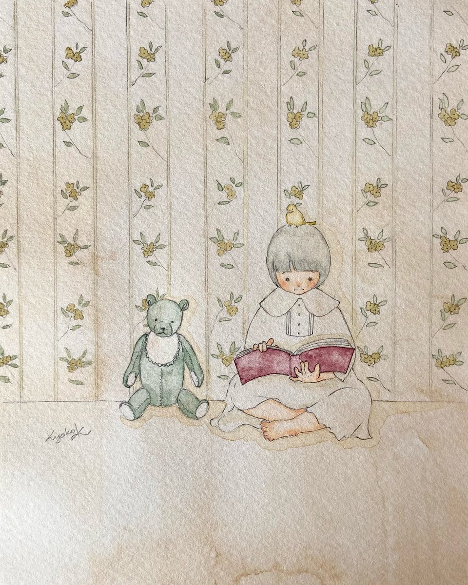 #水彩画 #水彩イラスト #アナログ絵 #アナログイラスト #絵本 #女の子イラスト #テディベア #読書 #ラグマット #ビンテージ壁紙