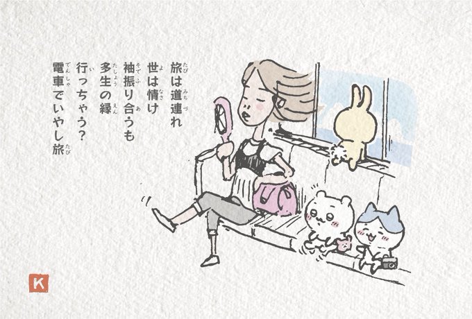 『行っちゃう?電車でいやし旅』 おしゃれ姉さんとちいかわ達が 電車で出会って一緒に旅に 出掛けることになりました。 みたいな、 列車の旅キャンペーンとか やったらイイんじゃない? っていう旅広告風イラストです。 #ちいかわファンアート
