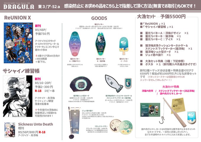 Comic Market100 8/14 ( 2日目:日曜 ) 東3 ア52a <DRAGULA> アークナイツ スペ 新刊やグッズ各種 お品書き&サンプルです 暑さ等いろいろ厳しいと思いますが ご無理の無い範囲でお体大切に お時間良い時にでも お越しいただければ幸いです よろしくお願いしますー webcatalog-free.circle.ms/Circle/16212828