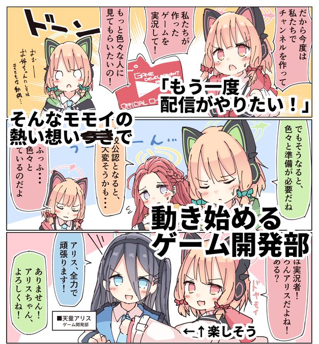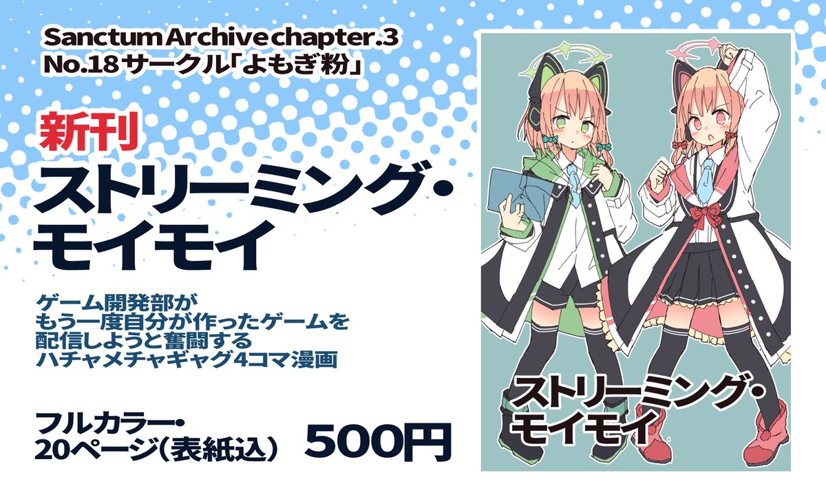 今月3日(土)に開催されるサンアカ3でサークルよもぎ粉(No.18)が頒布する予定の本です❗️ ゲーム開発部の皆がもう一度配信をするために、色々頑張るフルカラー4コマ漫画です。 ☀️☀️お品書き等はリプ欄をご覧頂ければ幸いです。
