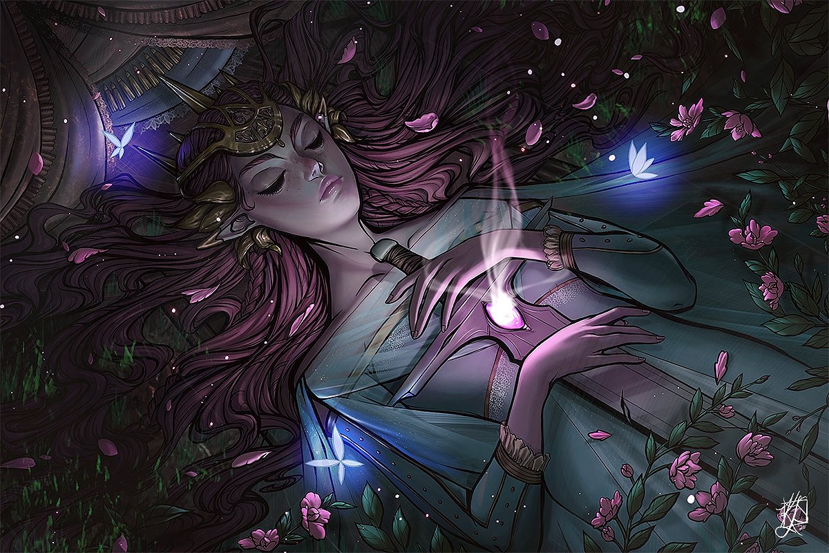 Hey it's #PortfolioDay! My name is Kathryn and I am a freelance fantasy artist, specializing in linework and everything glowy-glowy. I've worked in ttrpg and tcg's for over a decade and am looking to get into more illustrative work for literature (cover art mainly).