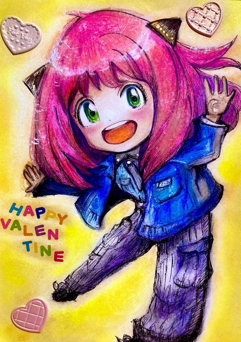 バレンタインイラストはアーニャちゃんにしました🥰着ているのは職場の制服です🧑🔧 今年から新しくなるので、最後にアーニャちゃんに着てもらいました💖 #バレンタインイラスト #アナログ画 #バレンタイン2023