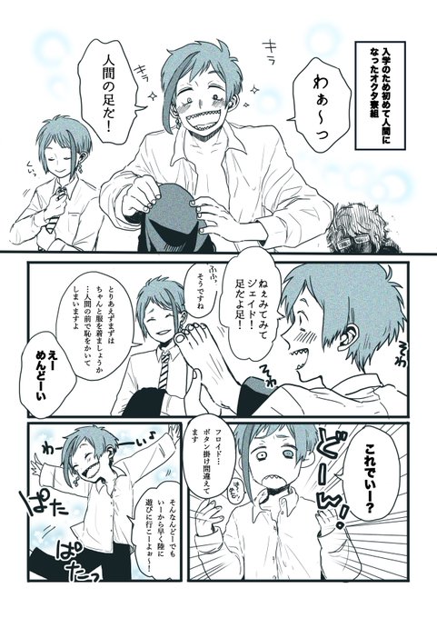 🦈「やっほ〜♡タコちゃん♪」 🐬「あいかわらずまるまるとしていておいしそうですね」 🐙「ぼくをたべようとするなよぉ!」 #ツイステファンアート 三章を読んでからこの三人が尊くて仕方ないです… フロイドがいつからアズール呼びになったのか気になる…!