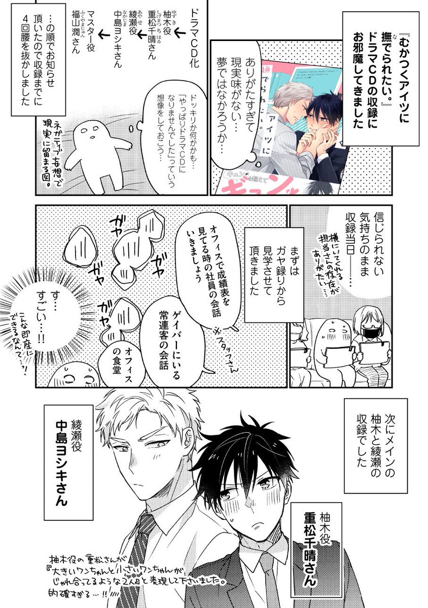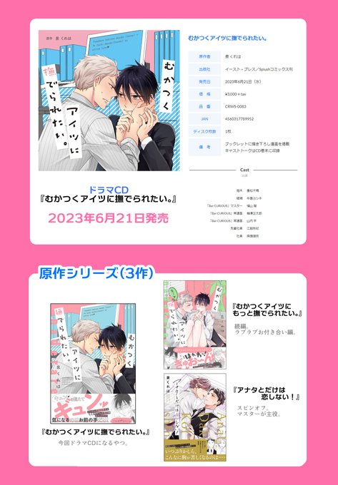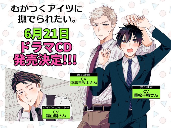 ❣️ ドラマCD化決定 ❣️ 『むかつくアイツに撫でられたい。』がドラマCDになります🎉🎉 🧡柚木役:重松千晴さん 💙綾瀬役:中島ヨシキさん 🟣マスター役:福山潤さん CROWN WORKS様より、2023年6月21日(水)発売予定✨ よろしくお願いします~! #むかつくアイツに撫でられたい #商業BL
