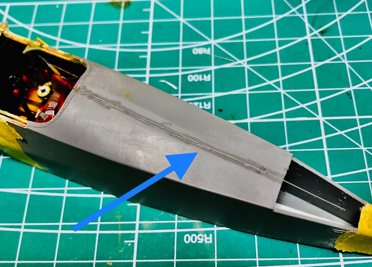 左右合せの飛行機の胴体のような長い接合部を消すのに苦労することもありますよね。 継ぎ目にパテを塗り込む前に伸ばしランナーを継ぎ目に埋め込んでおくと綺麗に消すことができるよ。