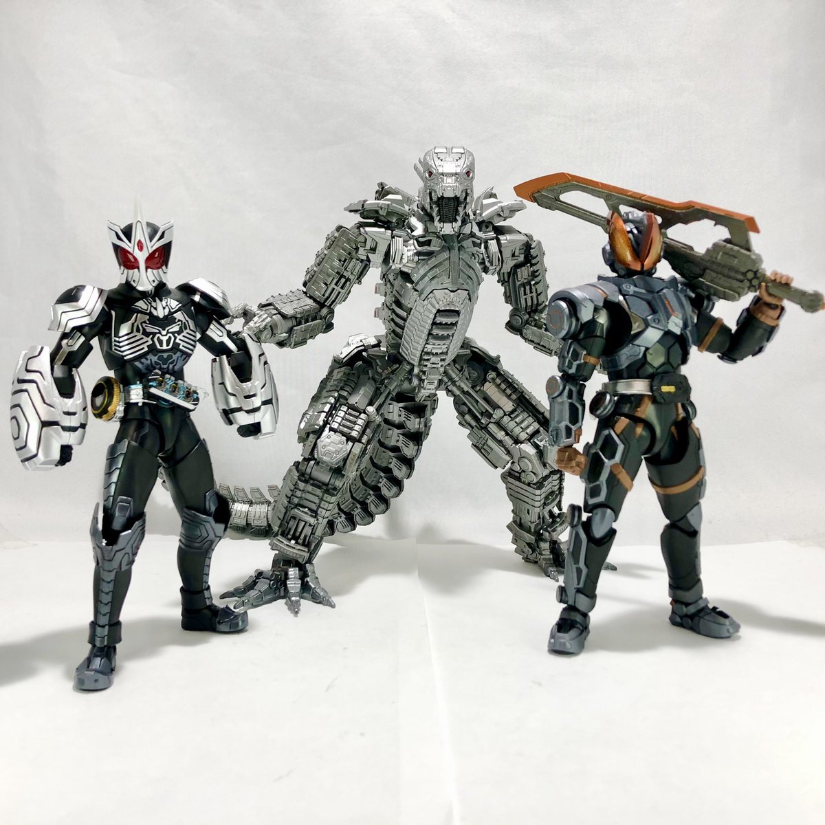 S.H.Figuarts 真骨彫製法 仮面ライダーオーズ サゴーゾコンボ S.H.Figuarts 仮面ライダーバスター 玄武神話 S.H.MonsterArts MECHAGODZILLA FROM GODZILLA VS KONG (2021) 3体並べた時のインパクトがゴツすぎる12月プレバンアーツ組 #フィギュアーツ写真部