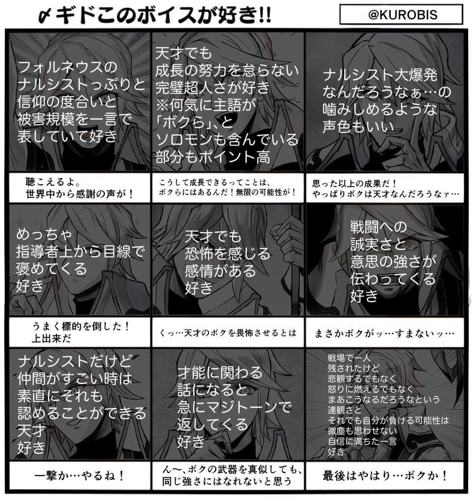 ここが好きだよフォルネウス台詞。ていうかもう選ばずとも全部好きだよ。厳選できないよ。テンプレお借りしましたありがとうございます。 #〆ギドこのボイスが好き