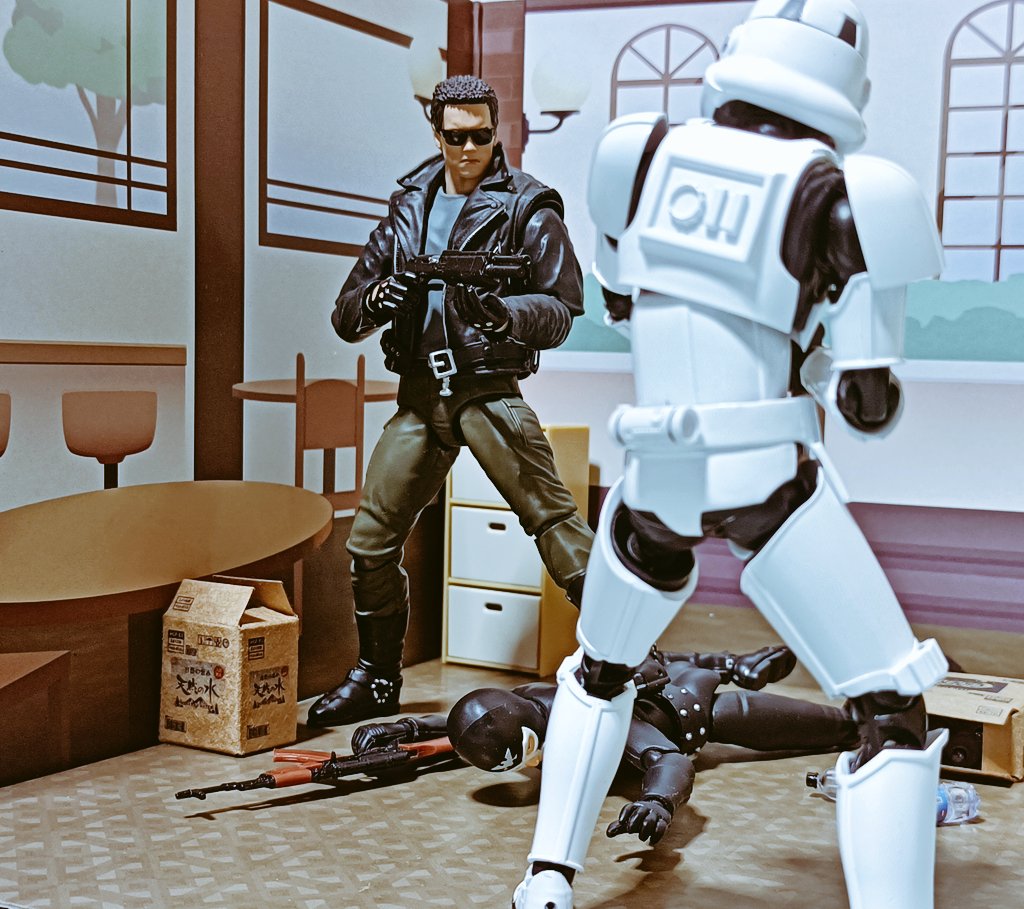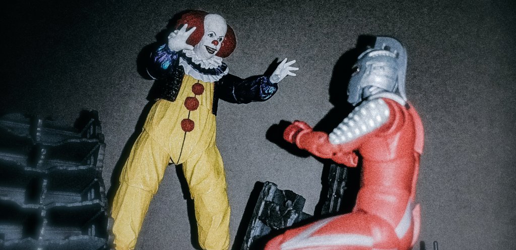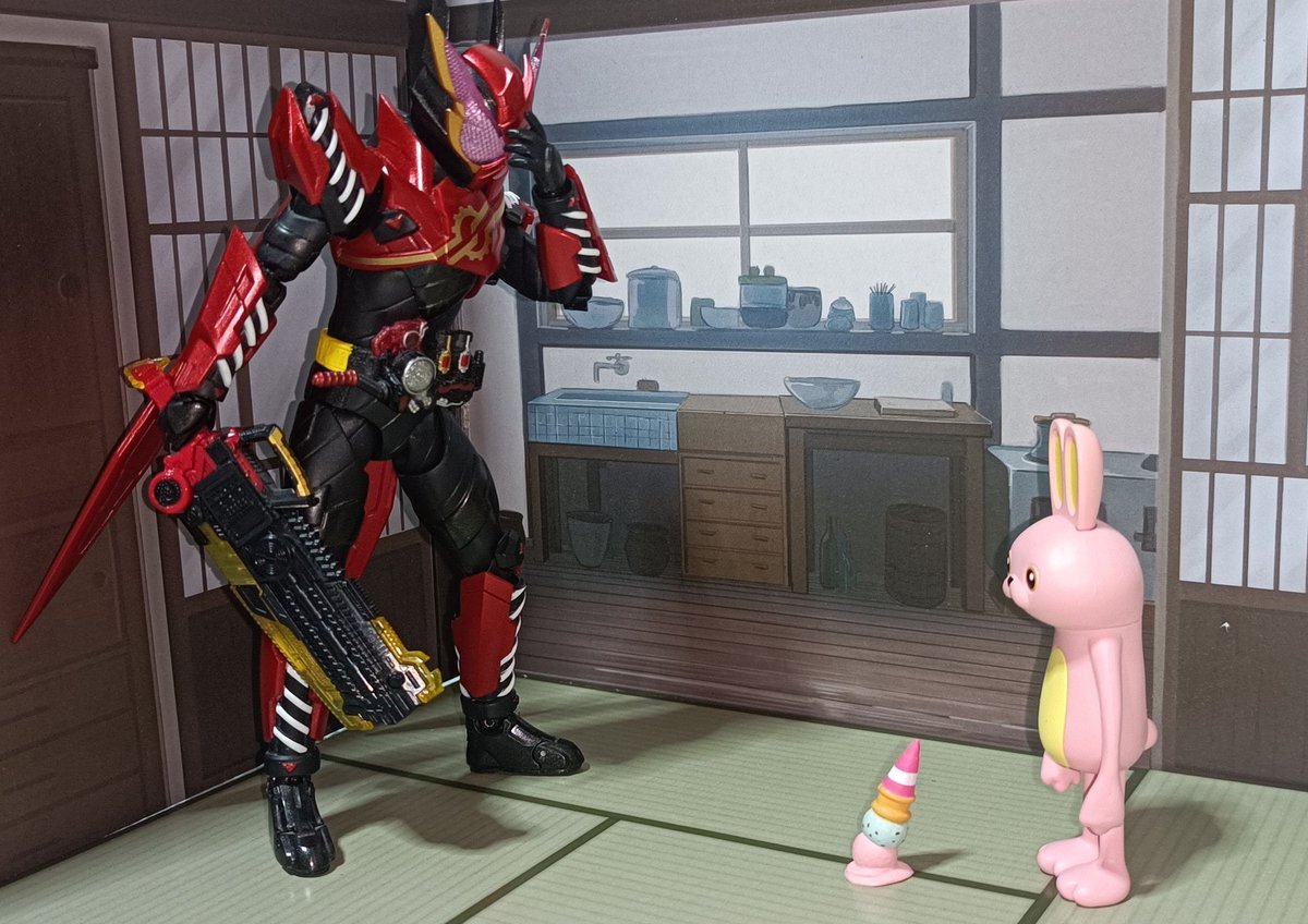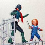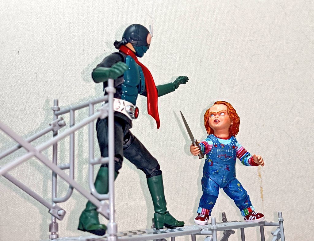 #夜のフィギュア撮影会 テーマ『斬』 本郷猛「しまった!?この足場はこの先で行き止まりだと!?」 チャッキー「ここで終わりだな、ライダー!!さぁ磨きに磨き上げたこの包丁で斬りつけてやる!!」