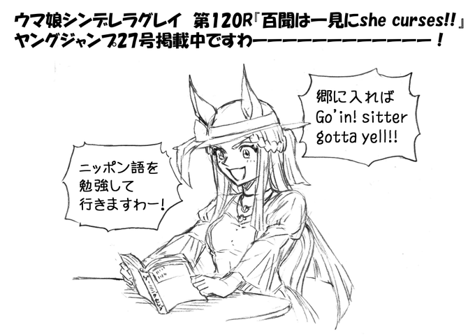 本日発売ヤングジャンプ28号にて ウマ娘シンデレラグレイ第120話掲載中! ynjn.jp/app/title/1180 横書きの文字は外国語だと思ってもろて… 基本的にそのページで日本語と混在していなければ 読み易さ優先で外国語表記は割愛しております 突然日本語喋れるようになったわけじゃないよ