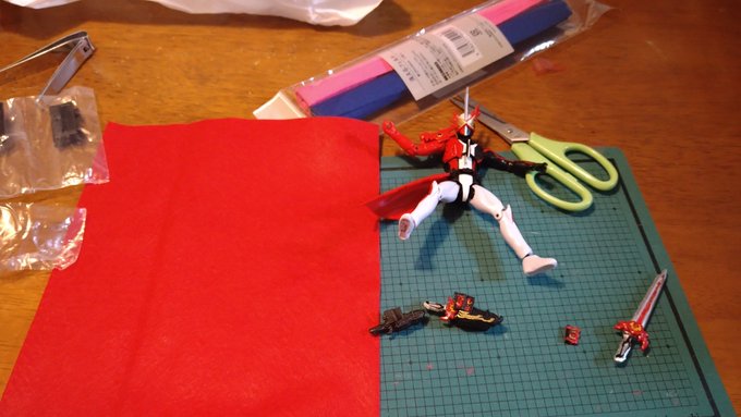 1 2 夜に制作(笑) RKFのセイバーを改良(笑) 腰のローブはフェルトを使用 ベルトはガチャでございやす(笑) #仮面ライダーセイバー #RKF #オモ写 21/02/02 23:22