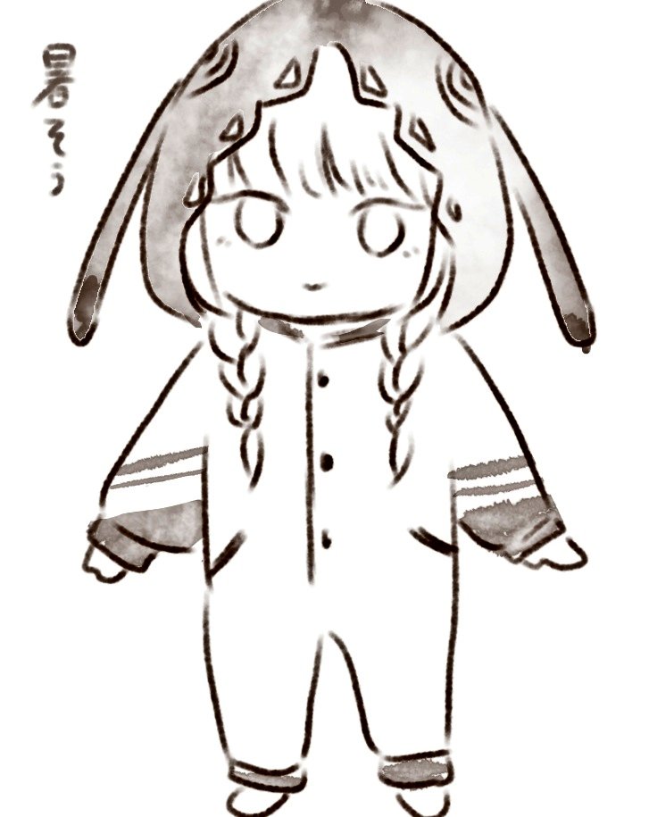 ワクチン2回目、熱上がってきた 暑いのに花譜ちゃんにつなぎパジャマ着せてしもた…ごめん… #花譜美術部
