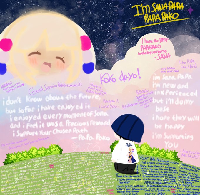 this drawing is dedicated to tsukumo sana and pakosun well known as papapako (Holoparents number 1 dad) in my opinion #galaxillust . . ps. all the writing comes from sana and papapako twitter interaction