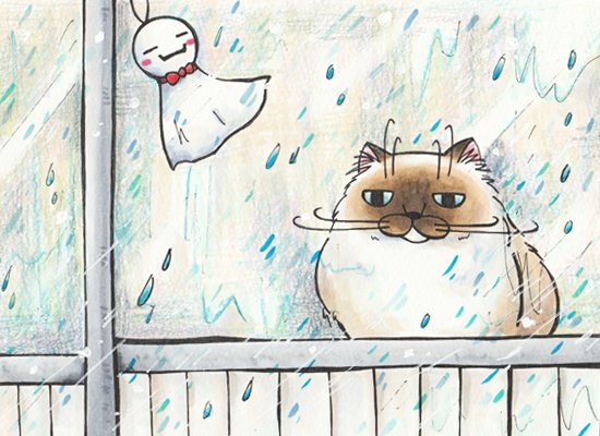 【雨の日のダルオ(A5サイズ、コピック・色鉛筆)2011年】 2012年用カレンダーイラスト。ベランダ大好きダルオ君が外に出られず、ちょっと切ない。 #雨 #原画 #コピック #梅雨入り