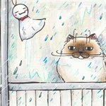3 22 【雨の日のダルオ(A5サイズ、コピック・色鉛筆)2011年】 2012年用カレンダーイラスト。ベランダ大好きダルオ君が外に出られず、ちょっと切ない。 #雨 #原画 #コピック #梅雨入り 21/05/17 11:30