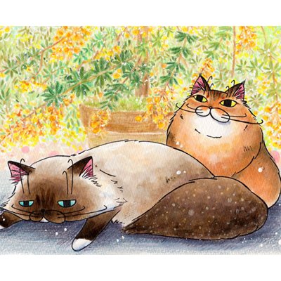 6 29 【ベランダ(A5サイズ、コピック・色鉛筆)2016年】 多分初めて描いたミモザの絵。実家のベランダには母の日にプレゼントしたミモザの木があって、下に落ちた花がらをダルオの尻尾が絡めとると、もう取れないんだな、これが。 #猫 #原画 #コピック #シャトンルージュ #ミモザ 21/02/25 14:37