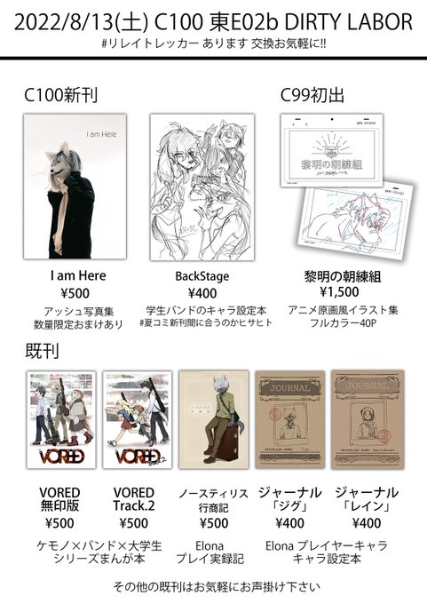 8/13(土)東E02b「DIRTY LABOR」おしながきです! 新刊はアッシュの写真集が出ます!少部数です! あとは間に合ったら何か本が出るかもしれません。 【新刊予約はこちら】 dirtylabor.booth.pm/items/4013316 #C100新刊 #C100 #リレイトレッカー 交換可! #夏コミ新刊間に合うのかヒサヒト