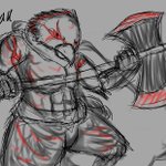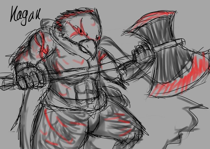 Kagak the Red Brood, born through a trial of blood and fire, a barbarian kenku, zealot of Iroas, and mercenary hired for his muscles. For a 4'11" birdlet, this voice-mimicking man-bird is surprisingly buff. #dungeonsanddragons#dndart#dnd