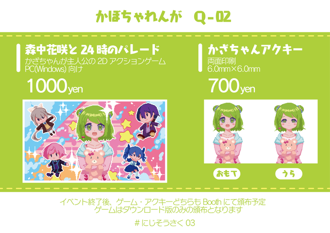 #にじそうさく03 Q-02 かぼちゃれんがのおしながきです 〇森中花咲と24時のパレード(PCゲーム) 〇かざちゃんアクキー(両面6.0mm*6.0mm) です!Boothでの頒布もする予定です!よろしくお願いします!!