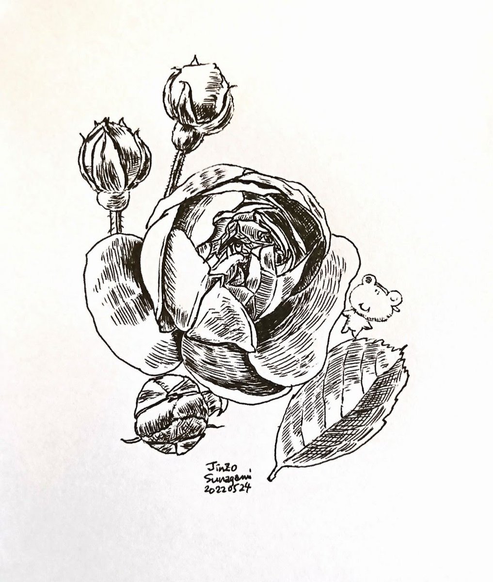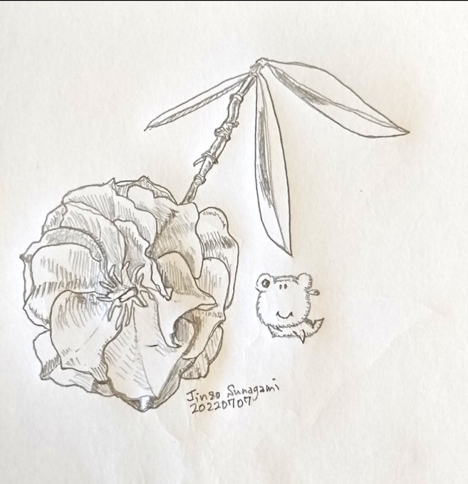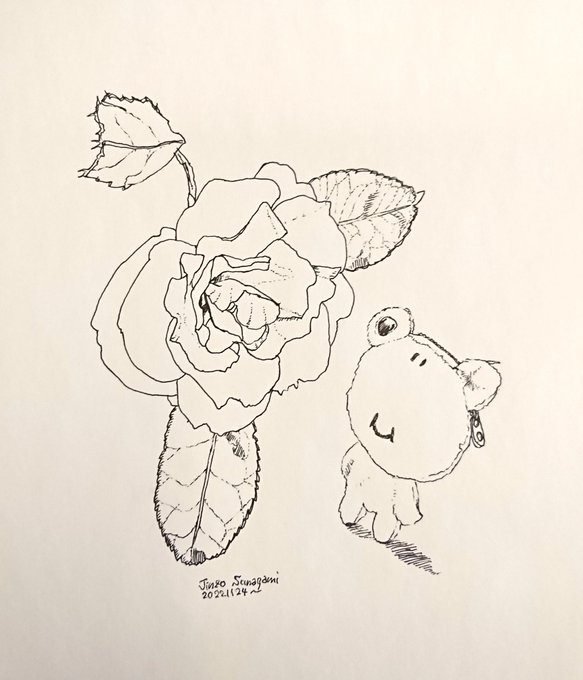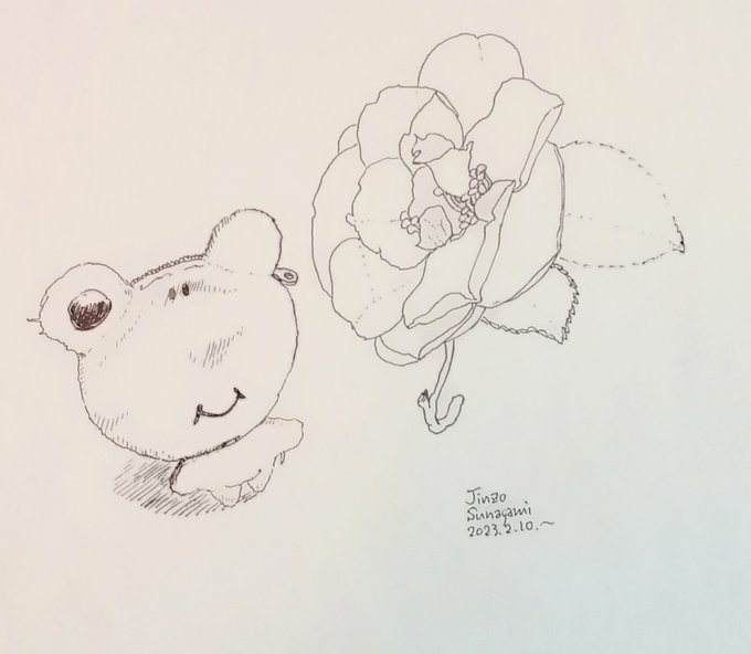 おはようございます GM Buenos dias 昨日は、117ものいいねと、貴重な13ものリツイート、フォローフォロバに、嬉しいリプを有難うございました。 今日は、サザンカとかえるの、ペン線画を描きました。 サザンカは、歌いながら、咲いていました。 #芸術同盟 #みんなで楽しむTwitter展覧会