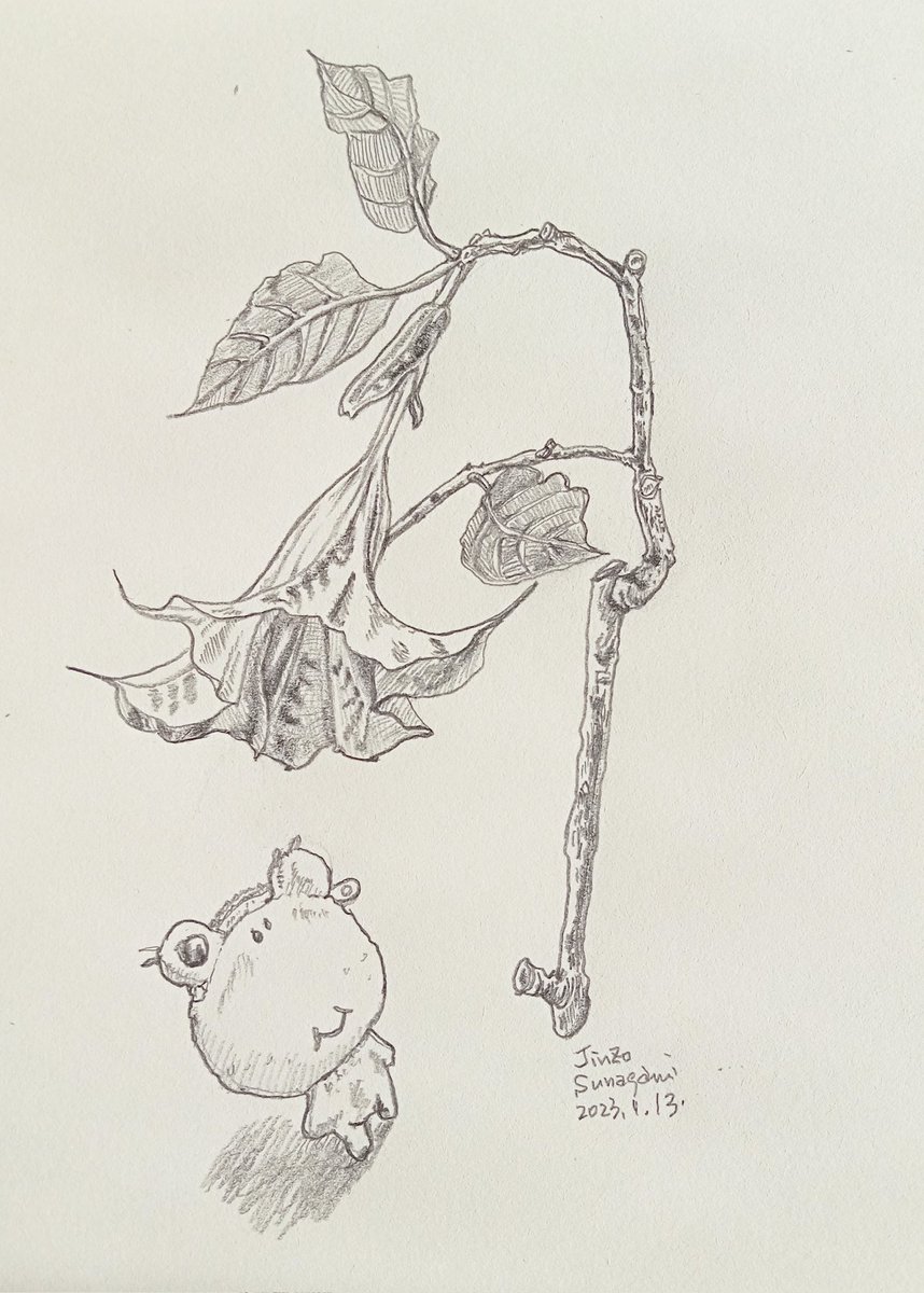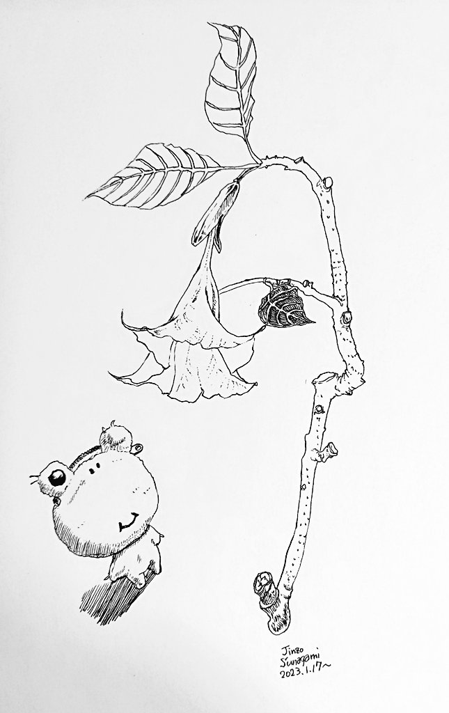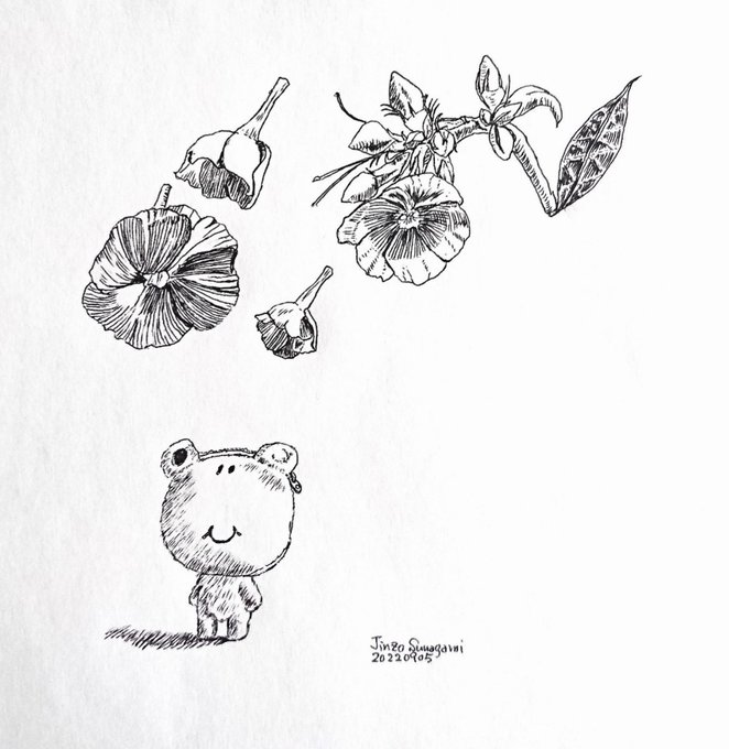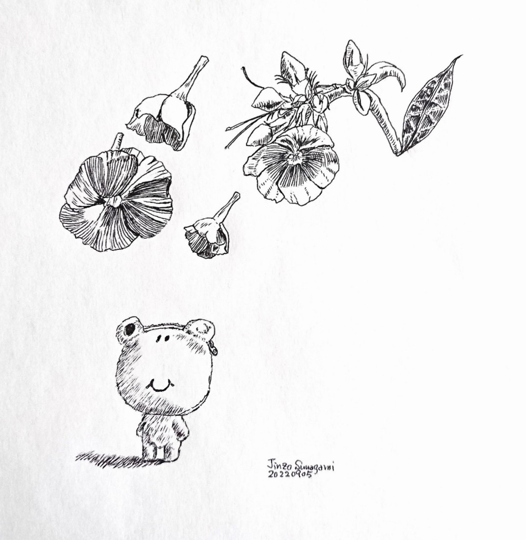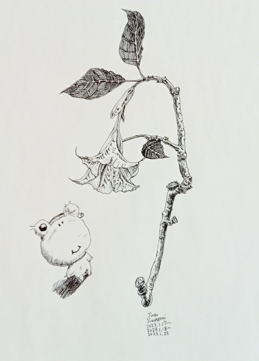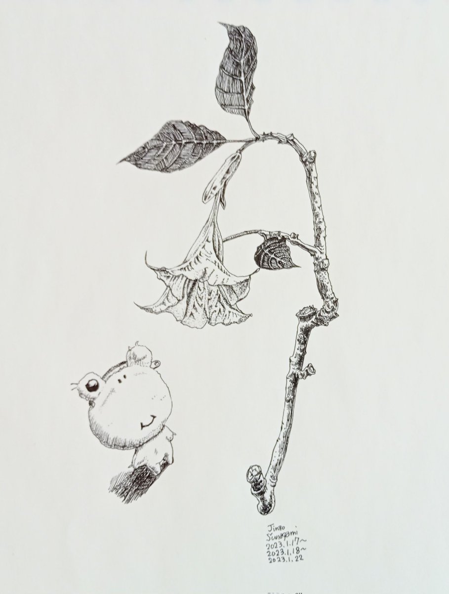 おはようございます GM Buenos dias 昨日は、102ものいいねと、貴重な12ものリツイート、嬉しいリプに、フォローフォロバを有難うございました。 今日は、キダチチョウセンアサガオとかえるのペン画を描きました。 晩秋のラッパは、嬉しそうでした。 #ARTRT #みんなで楽しむTwitter展覧会