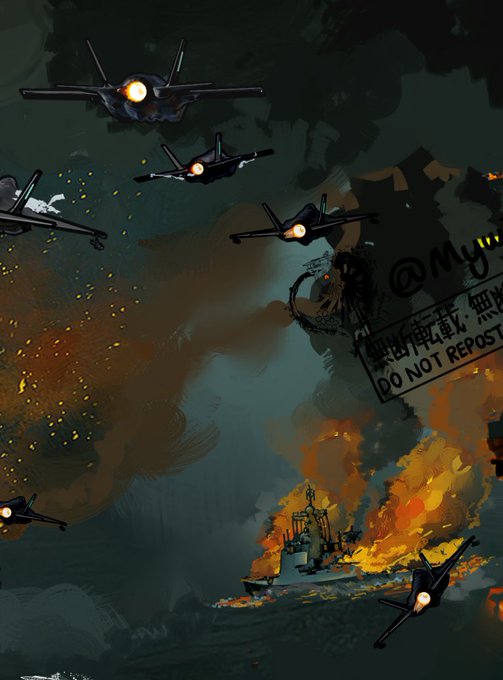 61 330 F35と沈没中の中国軍護衛駆逐艦(052B型) #イラスト好きな人と繋がりたい #イラスト 22/08/05 01:17