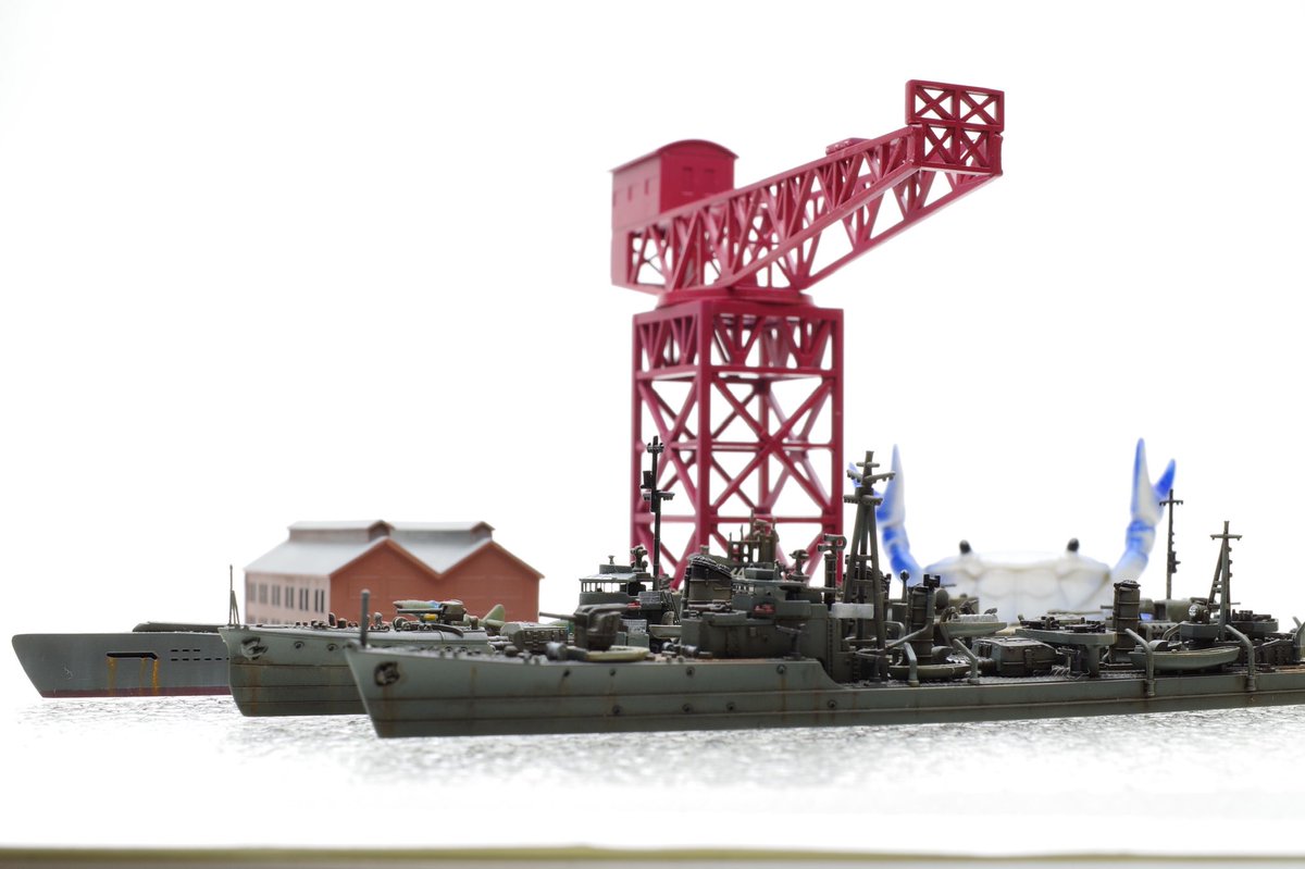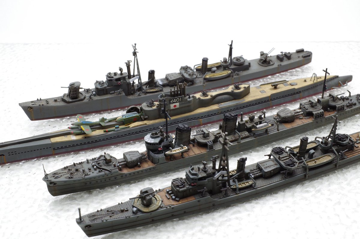 #今月作ったプラモ晒そうぜ 今月は3個! 手前から 「竹」ヤマシタホビー製1/700 「菊月(睦月ベース)」ヤマシタホビー製1/700 「伊401&晴嵐」アオシマ製1/700 (奥は過去作のタミヤ製1/700「松」) 今月は気がつくと艦船模型月間でした。