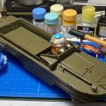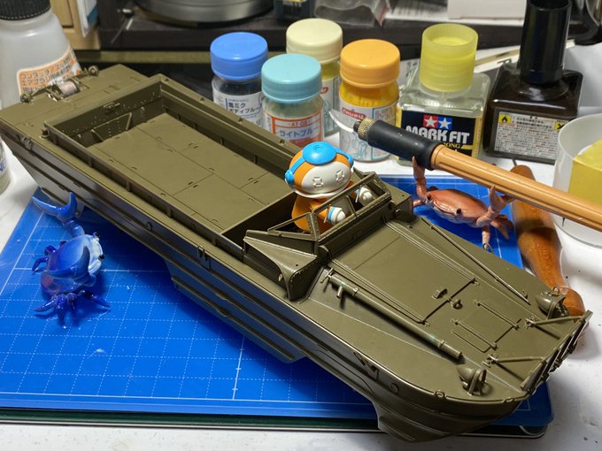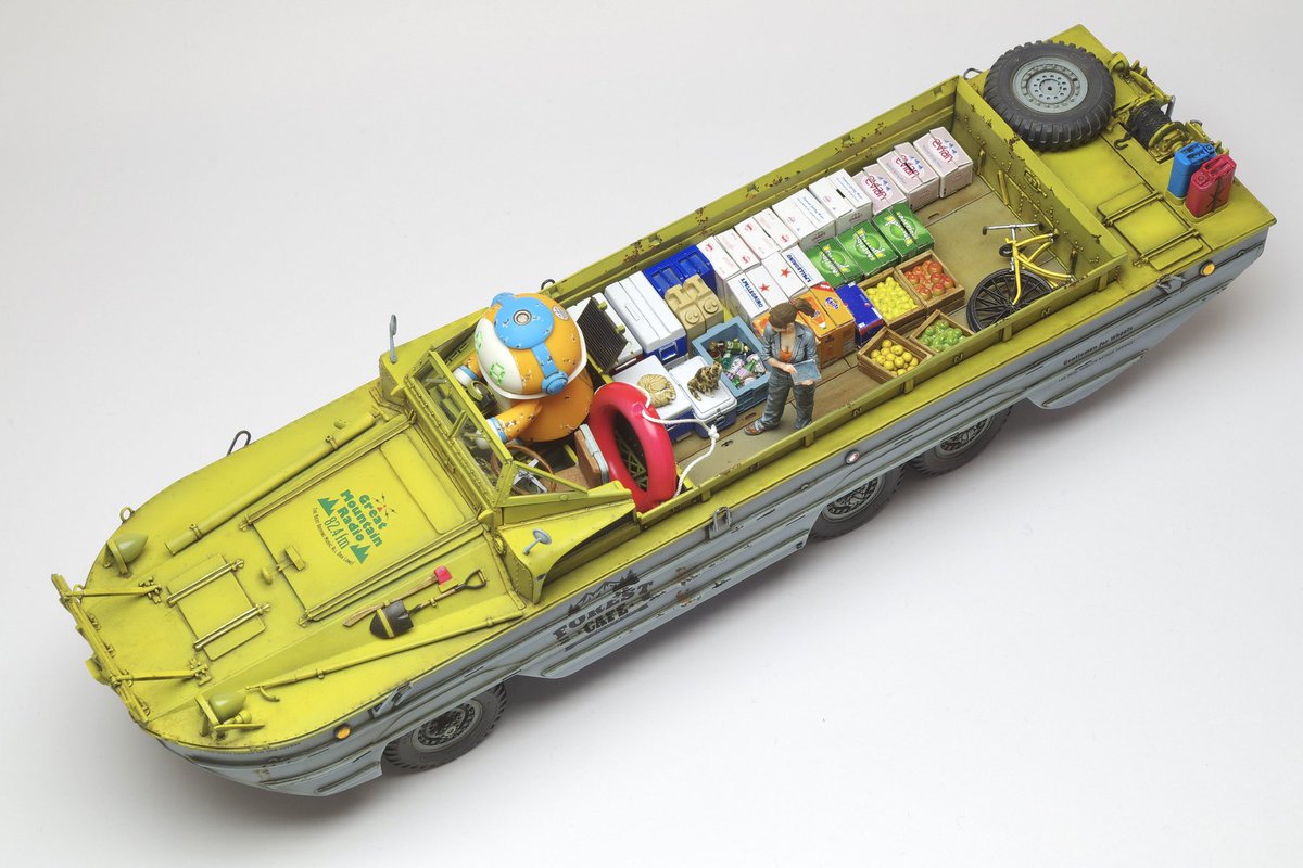 イタレリ1/35 DUKW 完成です! DUKWにGentleman & Wheelsのデカール貼ったらとてもカッコ良かろうと、民間払い下げのDUKWをイメージしつつ、SF仕様の自動運転レベル5なメカトロドライブDUKWとして仕上げてました😇 #ショップカー #アメリカンカープラモ #メカトロウィーゴ