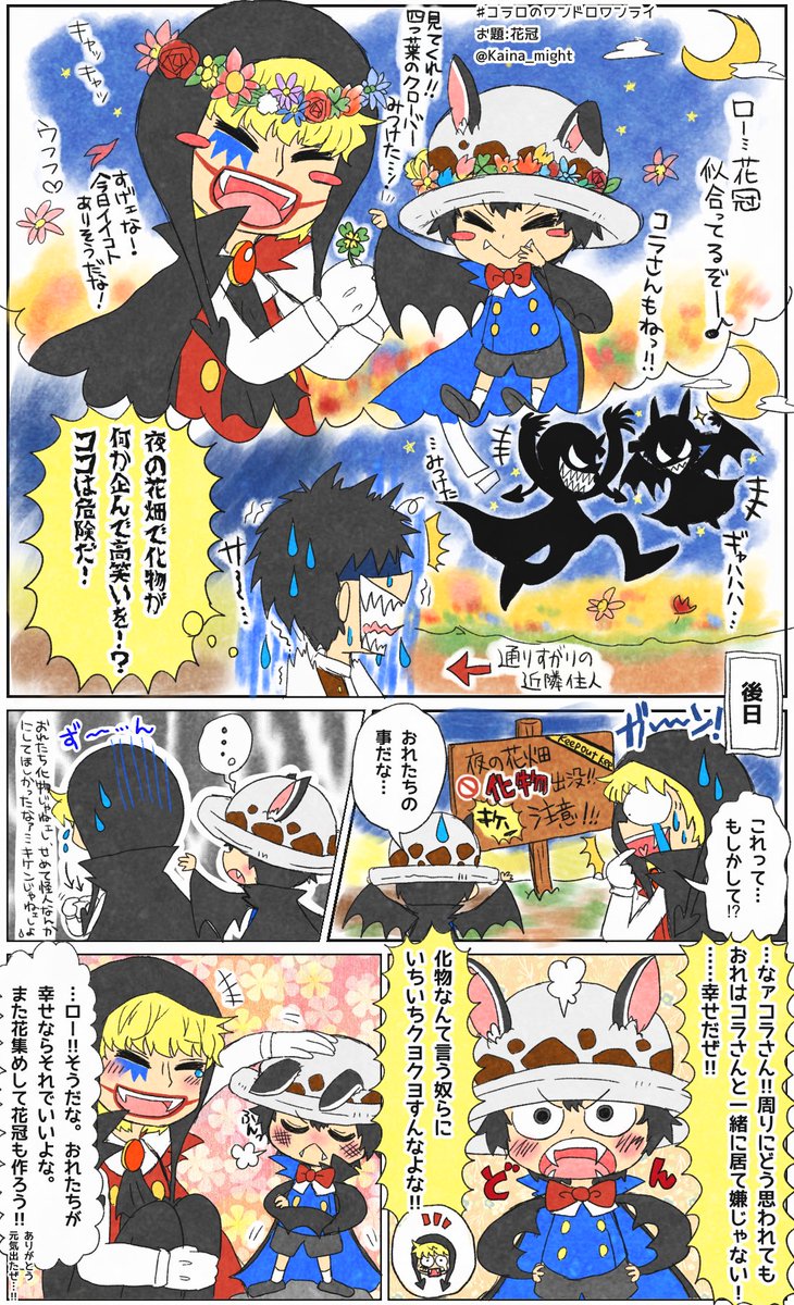 #コラロのワンドロワンライ お題:【花冠】 遅刻参加+1h(文字入色塗時間外) 吸血鬼こらさんと使い魔のコウモリロ〜が仲良く一緒に暮らしてる世界線…な設定です。ロ〜側がこらさんを元気付けるのも見たいなと思って描きました。