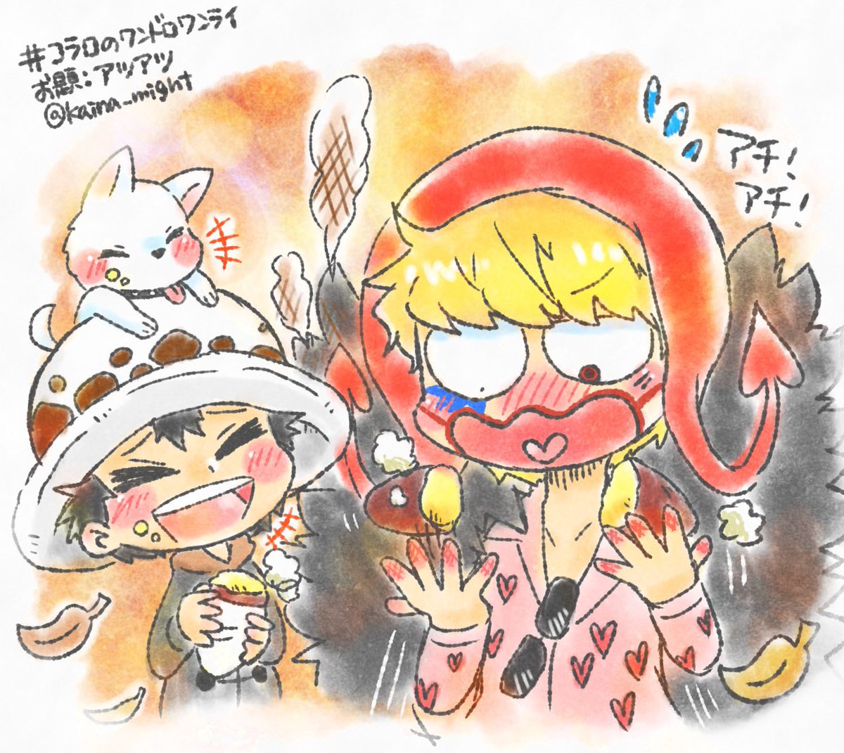 #コラロのワンドロワンライ お題:【アツアツ】 遅刻参加+15分 アツアツの🍠にアチアチ手を火傷しそうになるこらさんと、それを見て「なにやってんだよ!」と笑うロ〜です。🍠扉絵…大好きです。