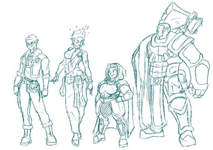 My new #DnDcharacter with his fwends Left to Right: Valorius (Changeling Blood Hunter) - Ignis (Fire Genasi Monk) - Alana (Dwarf Cleric) - Grom (Aeormaton Barbarian) #DnDart #DungeonsAndDragons