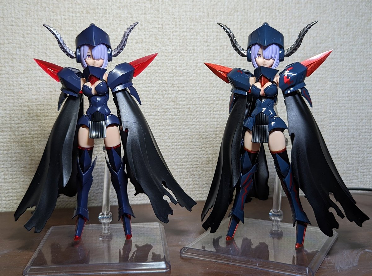 メガミデバイスエクスキューショナーこれにて、完成 2枚目は比較(右塗装したもの左素組) ちょいちょいパーツ割れたり塗装剥げたけどこれはこれで満足質感の違い?を少しでも表現出来てれば良いや 割れたりした所は、次の課題だな #メガミデバイス #エクスキューショナー #コトブキヤ #美プラ
