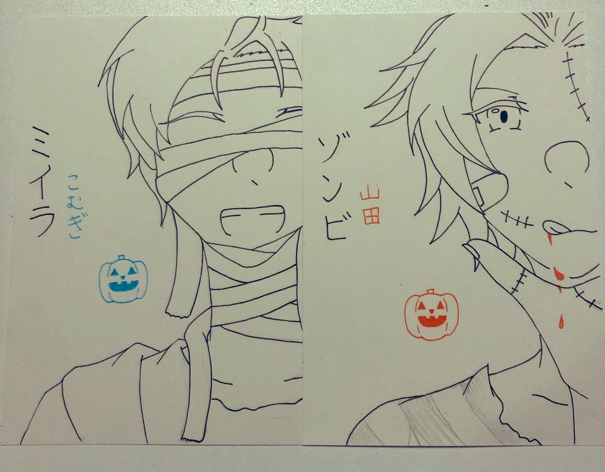 0 2 #メメリ絵 ⚠︎︎衣装捏造 ⚠︎︎血じゃないです ハロウィンということで。皆さんの衣装は個人的なものです。今日の動画は魔女っ子とかぼちゃさんで可愛かったですね。 捏造なので一応ワンクッション。狼人間吸血鬼キョンシー魔法使いゾンビミイラフランケンオバケの衣装です。 22/10/29 22:23