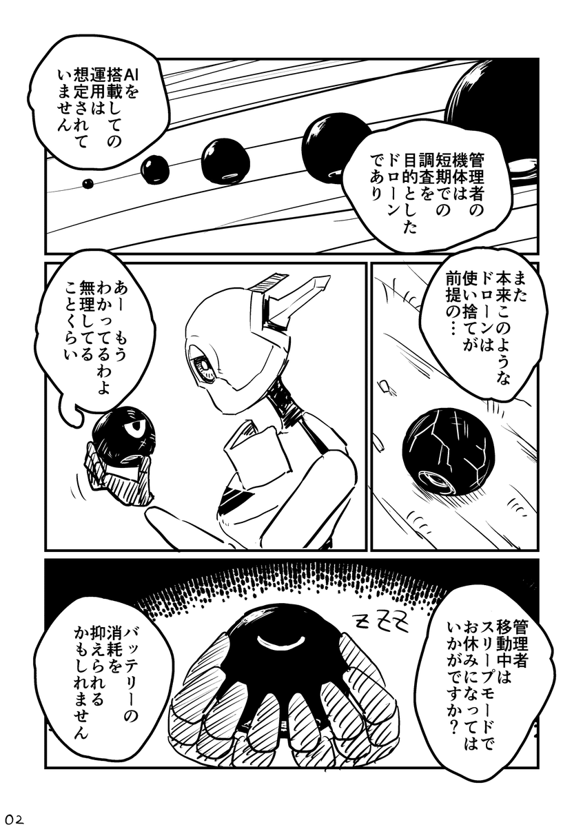 オリジナル漫画、「ロボくんと管理者」です。 ロボットとAI搭載ドローンの2人が旅をするお話です。短編集なので何話から読んでも大丈夫です(ちなみにこれは第二作目にあたります)。 全10ページ。 #オリジナル #漫画が読めるハッシュタグ (1/3)
