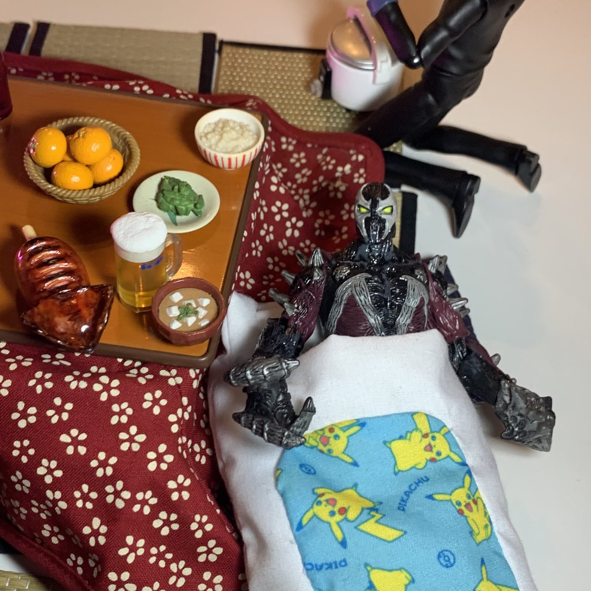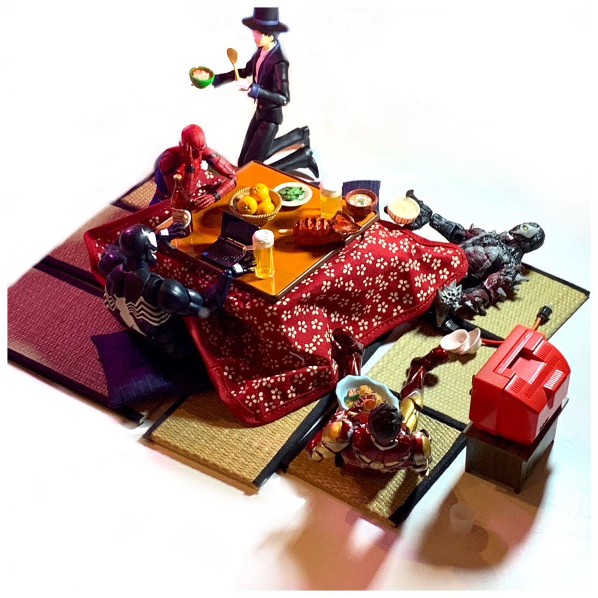 昨日の家飲みの後半がグダグダでサイコーだった #オモワザ #オモ写 #ツボルフ #MARVEL #スポーン #スパイダーマン #ヴェノム #アイアンマン #タキシード仮面 #ミニチュア #和風 #こたつ #ビール #みかん #イカ焼き #煮物 #ジオラマ