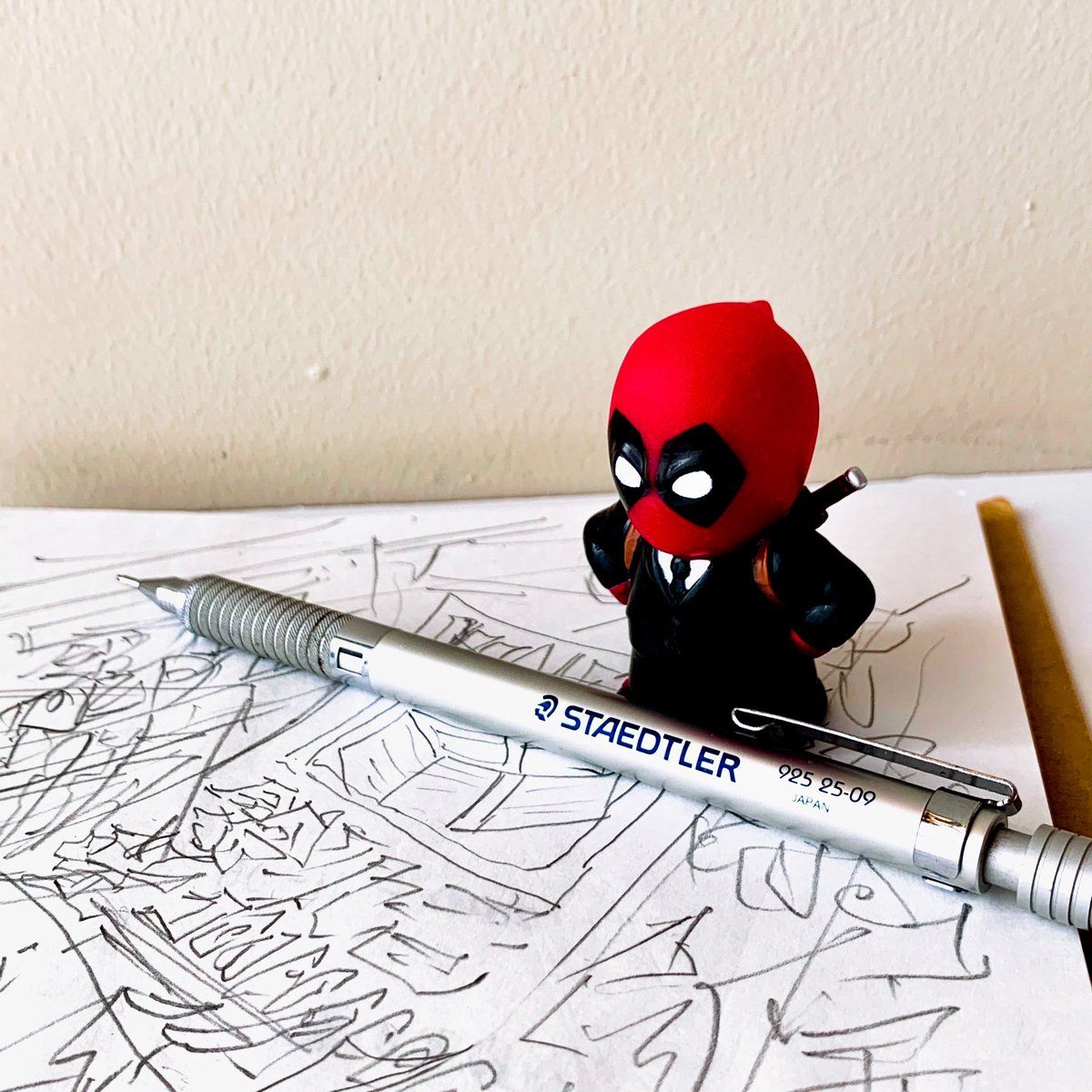 これから描くからな 鉛筆っていいよね金属が練り固められて木に埋まってるとか胸熱 メーカーで書き味が違うのも熱すぎ 推し銘柄はステッドラーよ ちなこのシャーペンは太芯で激ラブ 外観も金属マニアにはマジ神 みんな使って #オモ写 #デッドプール #イラストレーション #ステッドラー