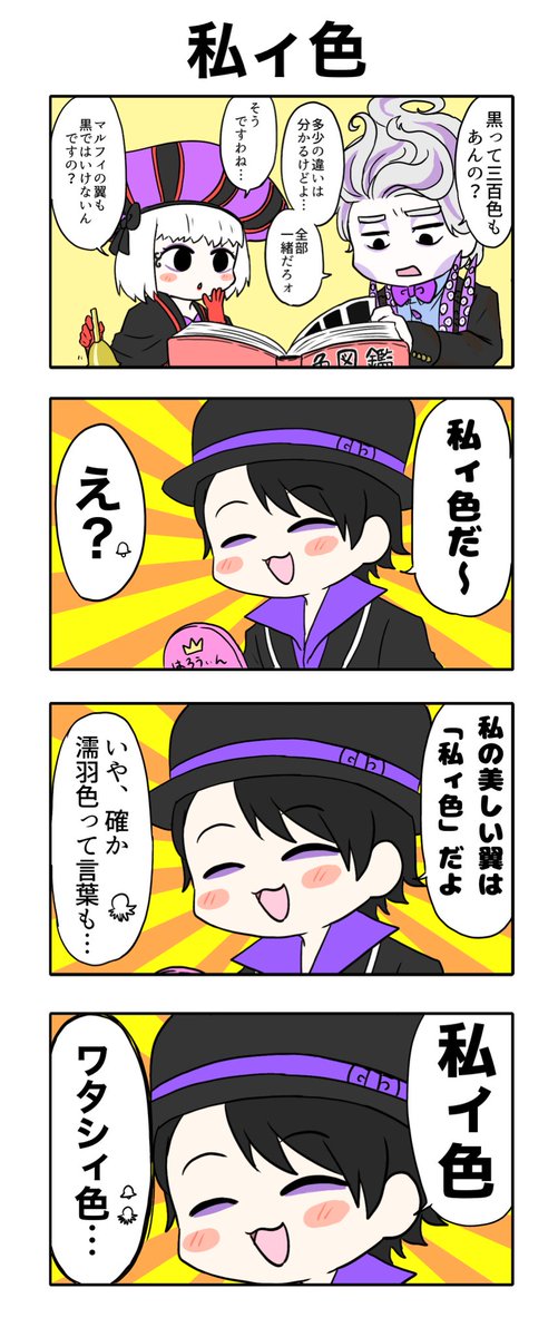 日向さんのアイデアを原案に四コマを描かせていただきました!一コマ目以外コピペでごめんなさい!紫トリオ可愛いね…… twitter.com/youtahimukai21…