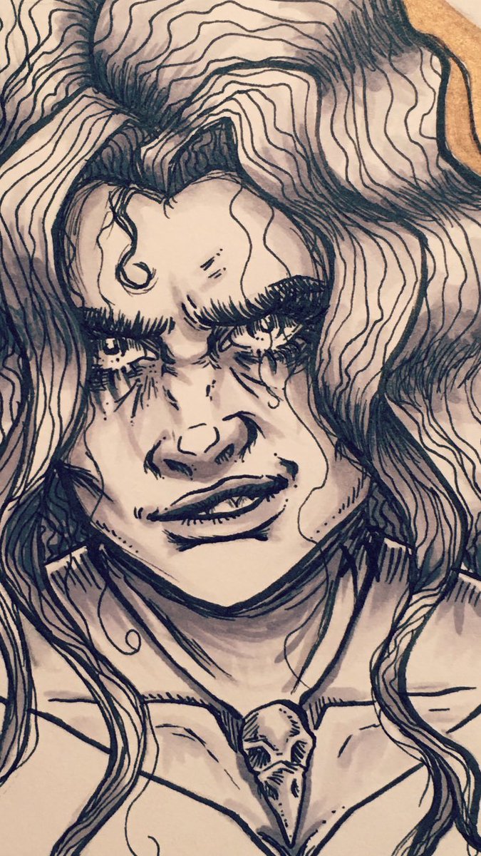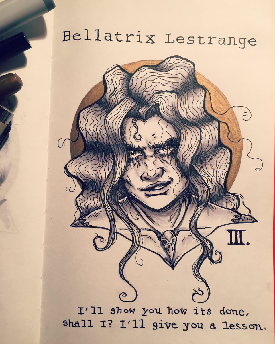 “I’ll show you how it’s done, shall I? I’ll give you a lesson” -Bellatrix Lestrange 🐍💀Harry Potter . . Materials: figma brush, copic sketch, micron liner and sharpie paint. #inktober #harrypotter #bellatrix #traditionalart