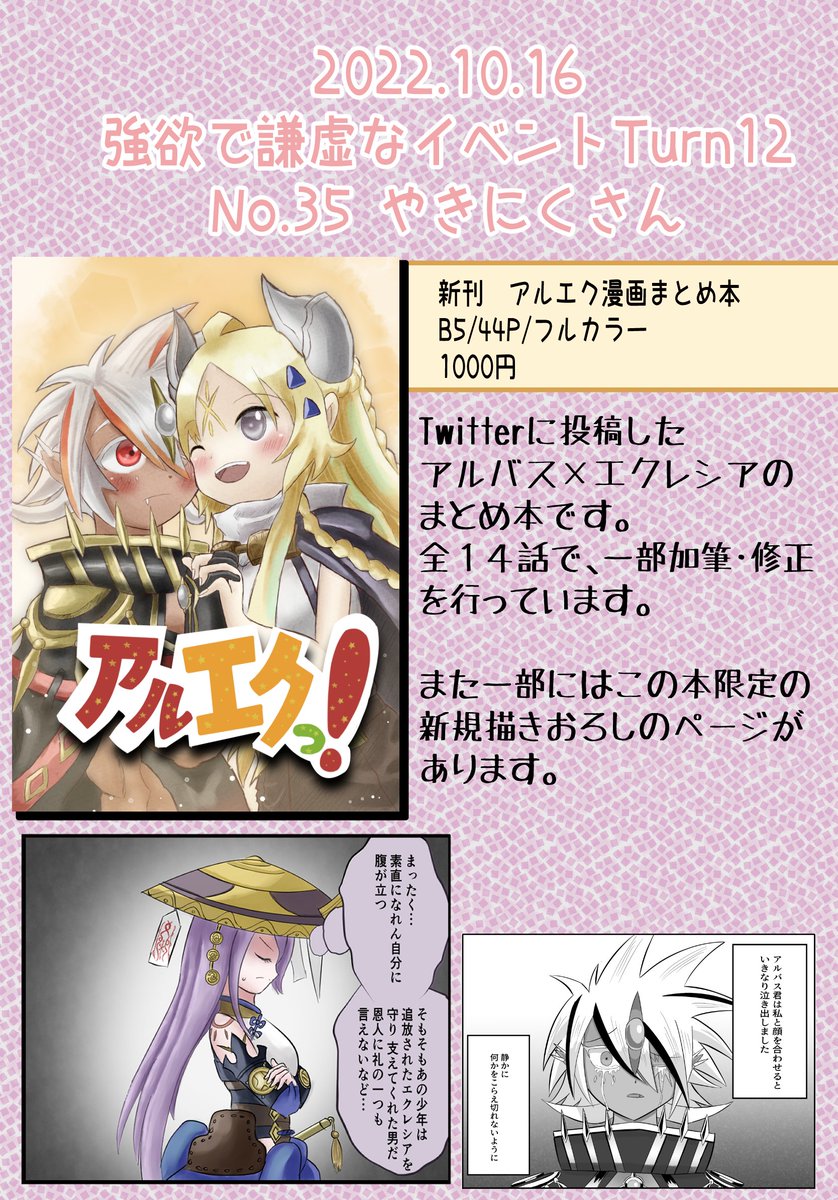 26 49 強謙イベントのお品書きが出来ました! 予告通りアルエク漫画のまとめ本出します! 新規描きおろしのページもあります! #OCGオンリー 22/10/04 22:00
