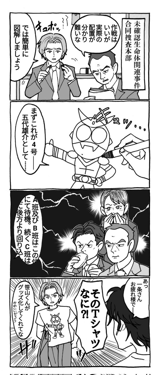 ちなみにこれは「中にいるのが五代雄介」という思いが強すぎるので見えもしないほくろまで描いてしまった「一条薫がうろ覚えで描いた未確認生命体第4号」という設定のらくがきです