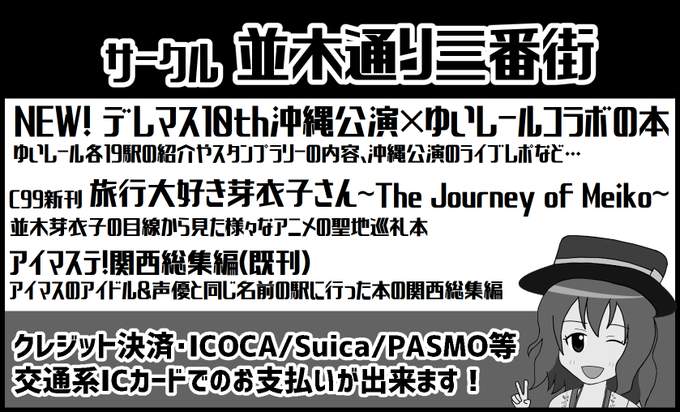 みなさま~(宣伝広報) いよいよ日曜日に迫ったシンステですが今回は冬コミの新刊などを頒布いたします。新しいものは[ゆ-63]にて頒布するシンデレラガールズ始末書合同でお楽しみください。 ICOCAなどの交通系ICカードやクレジットカードなどでの支払いが可能です!日曜日は神戸で握手! #cin_stage