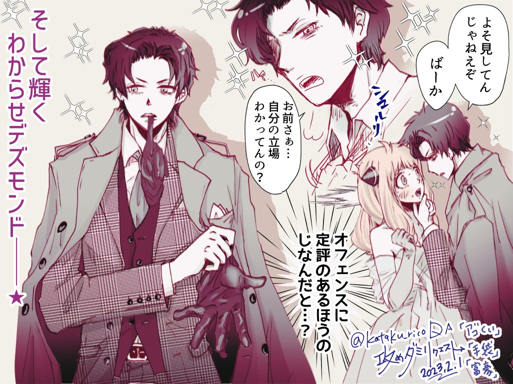 57 587 【攻めダミリクエストネタ】 ①富豪②手袋③顎クイ④闇落ち(謎時空ギャグ) 何らかのピンチに陥ったアーニャに救いの手を差し伸べたのは、憎らしい金満じなん! 望みのものを強引に手に入れたダミデズ青年と、心が読めるちゃっかりヒロインの、奇妙な同居生活が始まる──★ ※ダミアニャ成長if 23/02/04 18:47