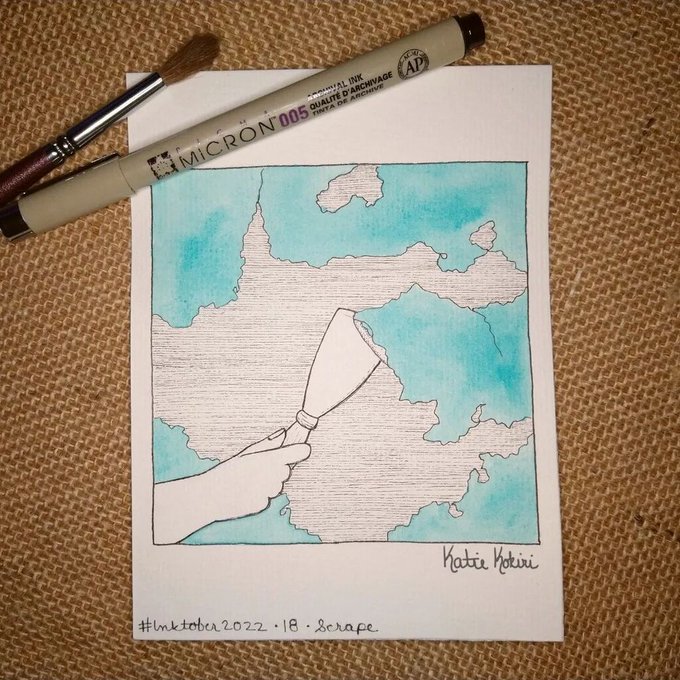 #inktober : Day 18 : Scrape Decided this one needed a little pop of color. P.S. Hands are hard. #inktober2022 #inktober2022scrape #ink #art #inkart #inkdrawing #mixedmedia #inkandwatercolor #watercolor #selftaughtartist instagr.am/p/Cj3--WSr0FR/