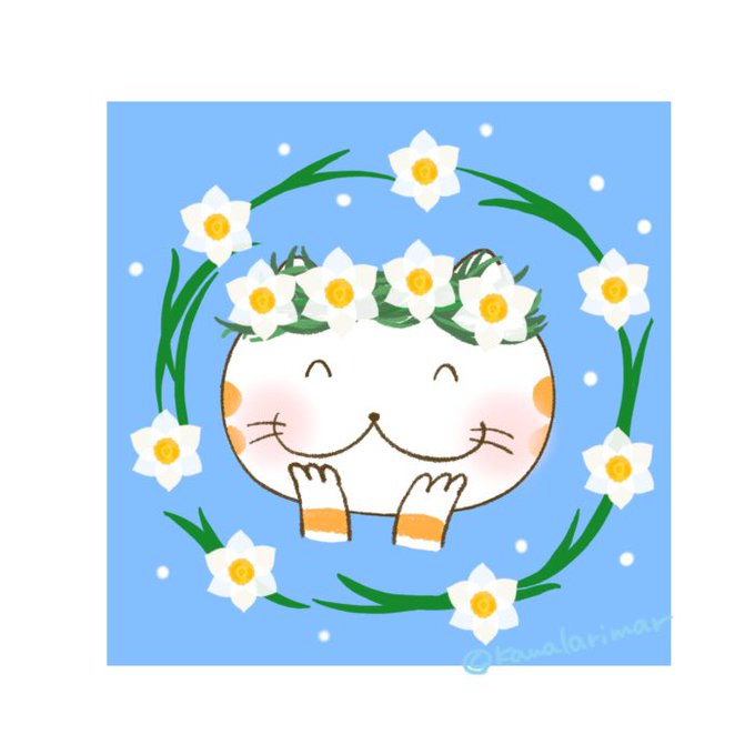 スイセンの花がキレイだったので猫さんに花冠を描いてあげました 【正月,Xmas,合格祈願,2023】発売中 line.me/S/sticker/2139… #お正月lineスタンプ #水仙 #イラスト #猫