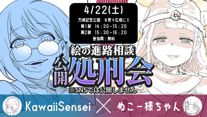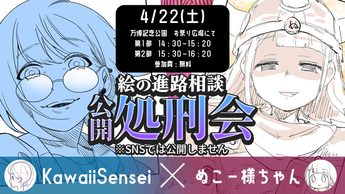 4/22 万博記念公園 お祭り広場にて ぬこー様ちゃんと「絵の進路相談処刑会」を開催します🎉 ※処刑会とは言いつつ、KawaiiSenseiは優しいです🤭 参加費無料で定員は計60名なのでお早めに! 応募はこちら! forms.gle/CUMj4eVmUpFnvD… twitter.com/i/web/status/1…