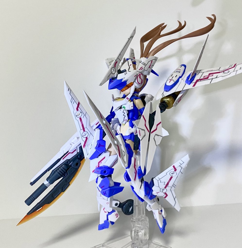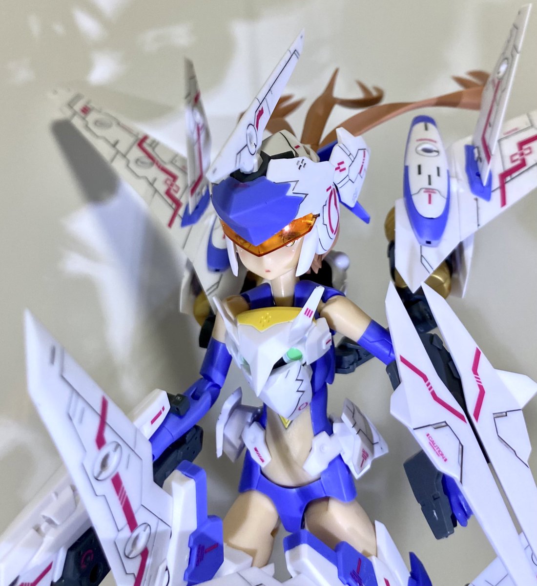 SOLラプター 武装モード完成‼️ 今回ははじめての流し込み墨入れと水転写デカール貼りに挑戦してみました😊特にデカールは量が多くて大変でした💦 武装は組み替えもできて楽しい! #メガミデバイス twitter.com/Kazu1325haru…